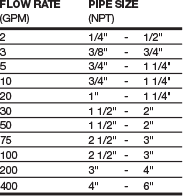 Last time we mentioned flow rate to be considered when selecting filters. Well, with flow rate, pipe size goes hand in hand. The filter must be properly sized to keep the pressure drop compatible with the fluid passing through it. A pump putting out 50 gpm, for example, will create less pressure drop when flowing through a 3″ npt pipe than through a 1″ npt pipe. The pipe size will help focus filter selection. This general reference chart relates pipe size to flow rate.