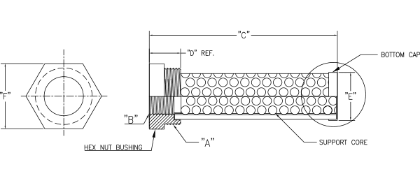 | Part Number | GPM | "A" NPT Size | "B" NPT Size | "C" Length | "D" Bushing Height | "E" Diameter | "F" Hex Diameter |
